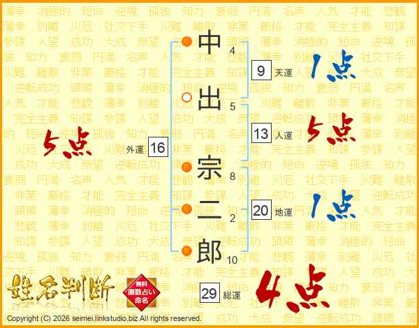 中(4画)出(5画) 宗(8画)二(2画)郎(10画)