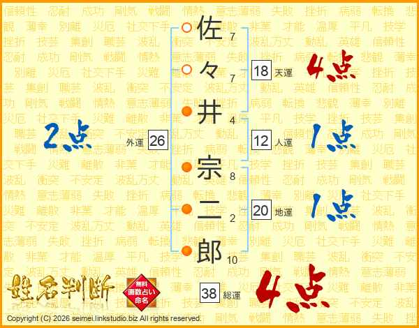 佐(7画)々(7画)井(4画) 宗(8画)二(2画)郎(10画)