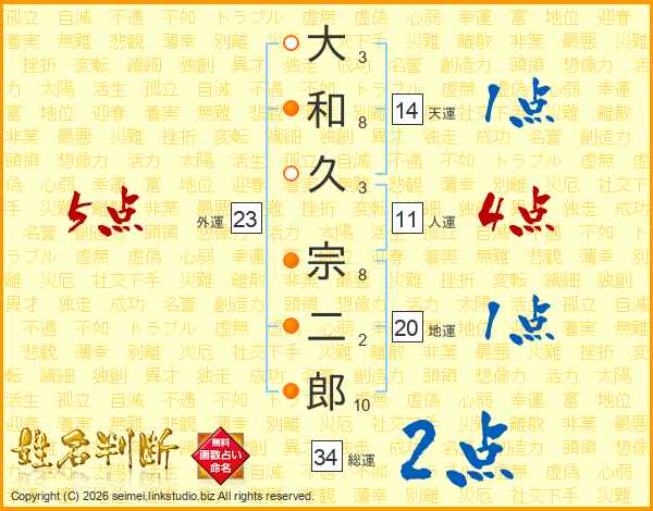 大(3画)和(8画)久(3画) 宗(8画)二(2画)郎(10画)