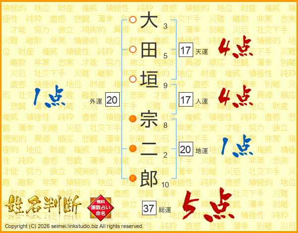 大田垣宗二郎さんの総運は37画の5点!