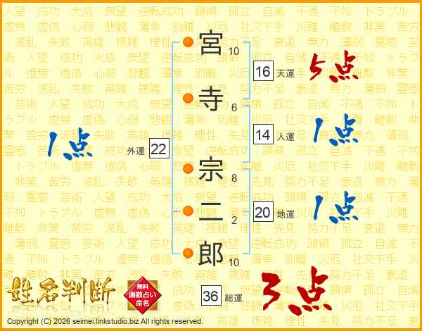 宮寺宗二郎さんの総運は36画の3点!