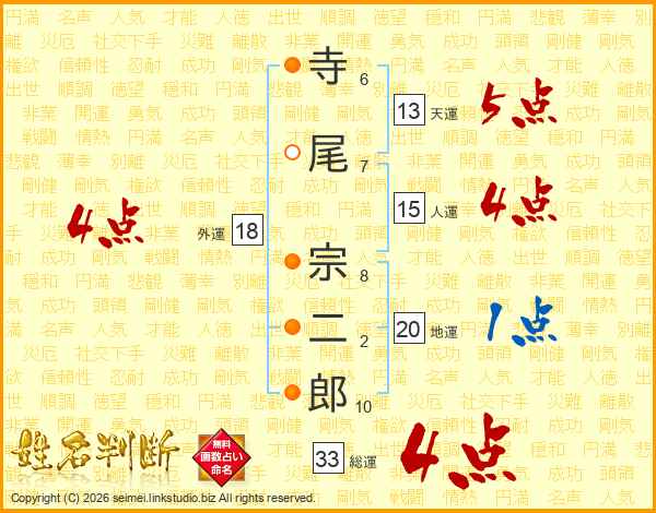 寺(6画)尾(7画) 宗(8画)二(2画)郎(10画)