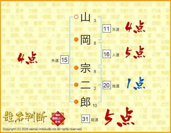 山(3画)岡(8画) 宗(8画)二(2画)郎(10画)