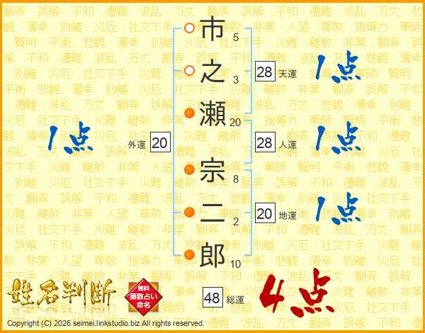 市(5画)之(3画)瀬(20画) 宗(8画)二(2画)郎(10画)