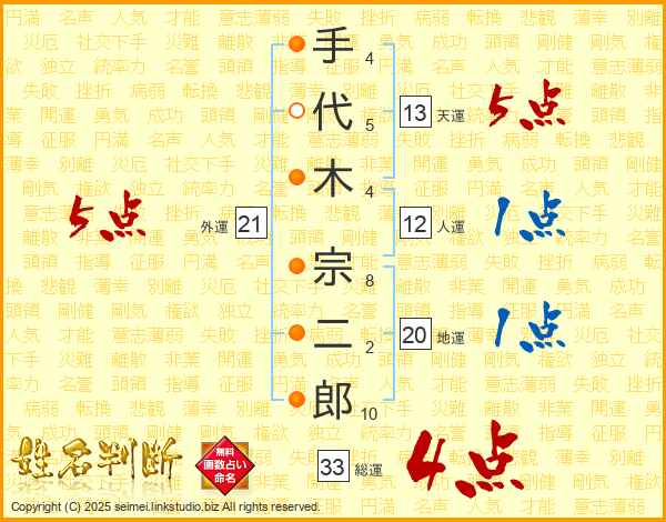 手(4画)代(5画)木(4画) 宗(8画)二(2画)郎(10画)