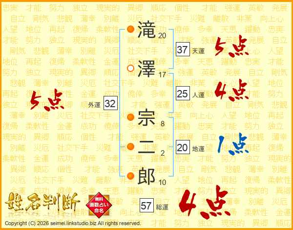 滝(20画)澤(17画) 宗(8画)二(2画)郎(10画)