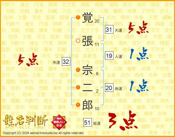 覚(20画)張(11画) 宗(8画)二(2画)郎(10画)