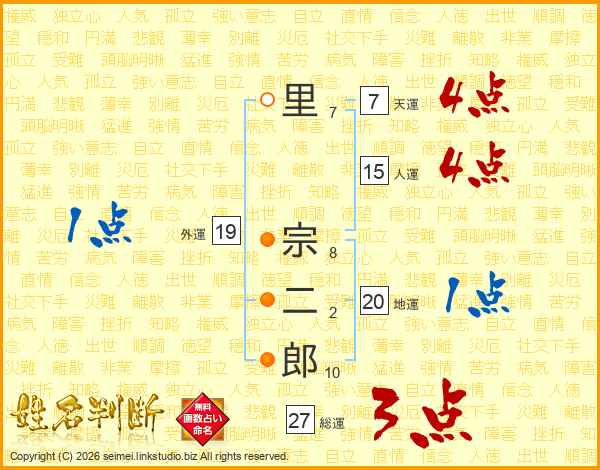 生活面を象徴する運勢です。外部から受ける影響力を表し、結婚運、家庭運や職場、環境への順応性を表します。総運から人運を引いた画数。姓や名が1文字の場合を除く。