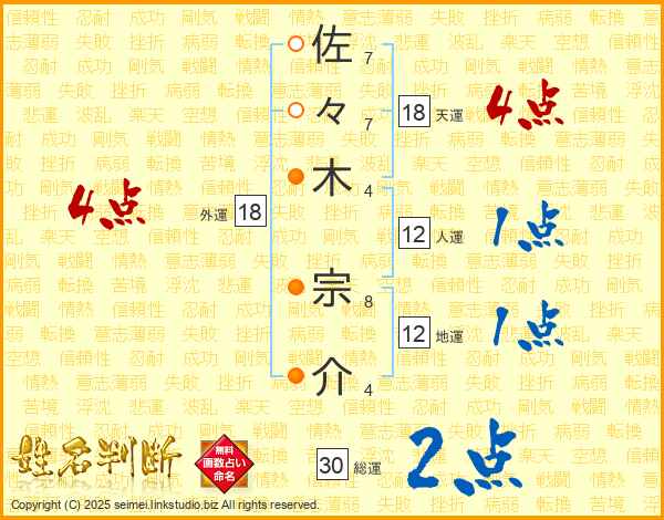 佐(7画)々(7画)木(4画) 宗(8画)介(4画)