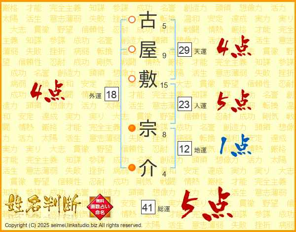 古屋敷宗介さんの総運は41画の5点!