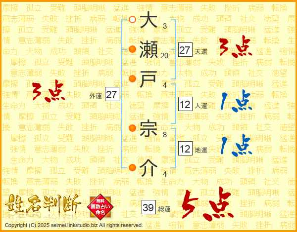 大(3画)瀬(20画)戸(4画) 宗(8画)介(4画)