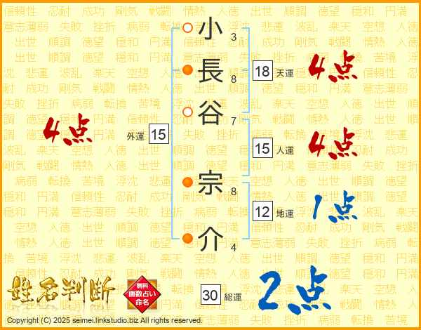 小(3画)長(8画)谷(7画) 宗(8画)介(4画)