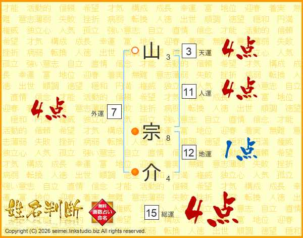 山宗介さんの総運は15画の4点!