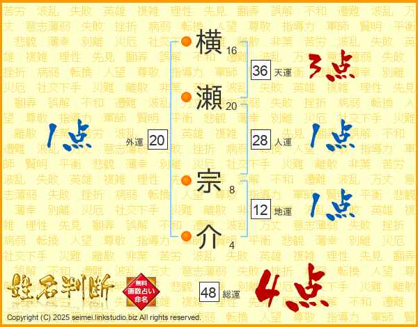 横(16画)瀬(20画) 宗(8画)介(4画)