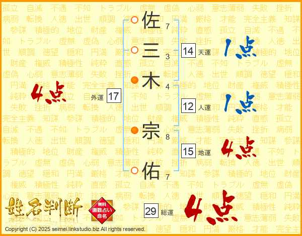 佐(7画)三(3画)木(4画) 宗(8画)佑(7画)