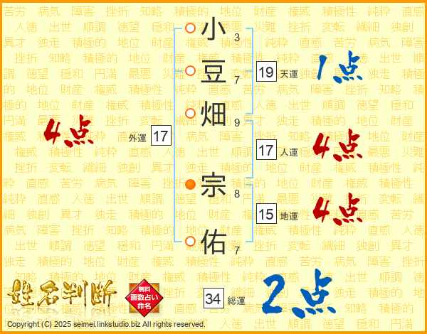 小(3画)豆(7画)畑(9画) 宗(8画)佑(7画)