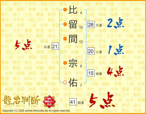 比(4画)留(10画)間(12画) 宗(8画)佑(7画)