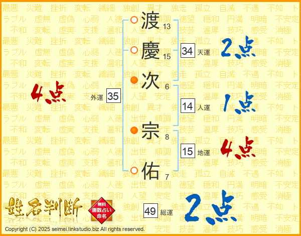 渡(13画)慶(15画)次(6画) 宗(8画)佑(7画)