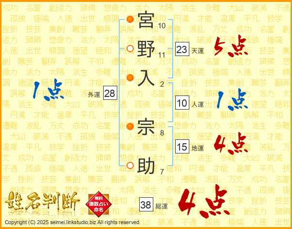 宮(10画)野(11画)入(2画) 宗(8画)助(7画)