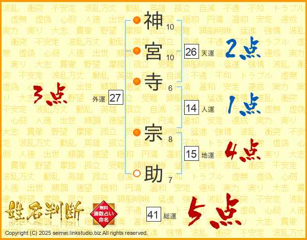 神(10画)宮(10画)寺(6画) 宗(8画)助(7画)