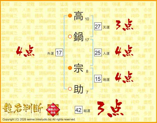 高(10画)鍋(17画) 宗(8画)助(7画)