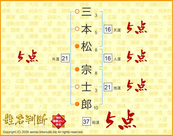 三(3画)本(5画)松(8画) 宗(8画)士(3画)郎(10画)