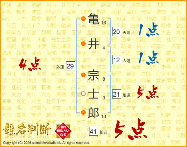 亀(16画)井(4画) 宗(8画)士(3画)郎(10画)