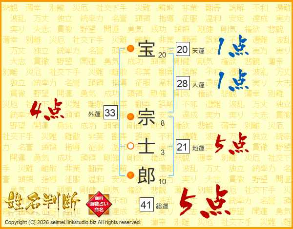宝(20画) 宗(8画)士(3画)郎(10画)