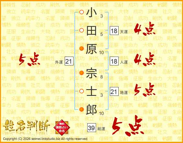 小(3画)田(5画)原(10画) 宗(8画)士(3画)郎(10画)