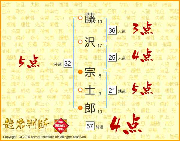 藤(19画)沢(17画) 宗(8画)士(3画)郎(10画)