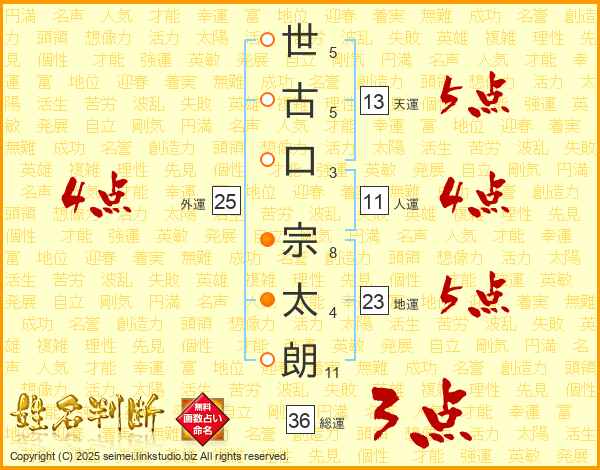 世(5画)古(5画)口(3画) 宗(8画)太(4画)朗(11画)