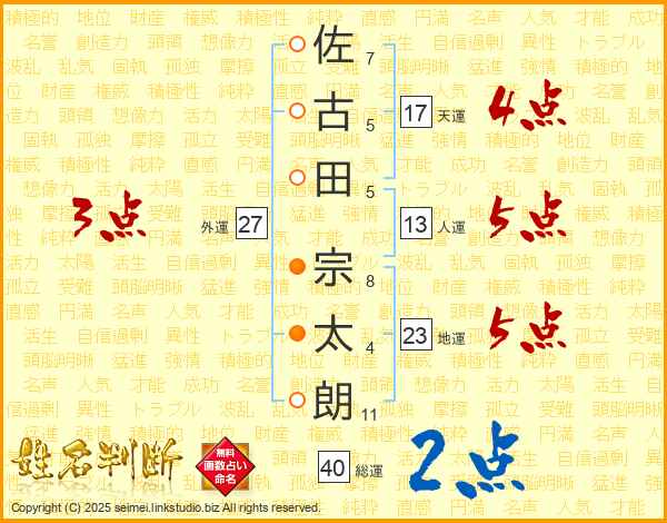佐(7画)古(5画)田(5画) 宗(8画)太(4画)朗(11画)