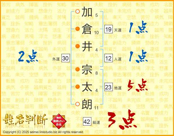加(5画)倉(10画)井(4画) 宗(8画)太(4画)朗(11画)