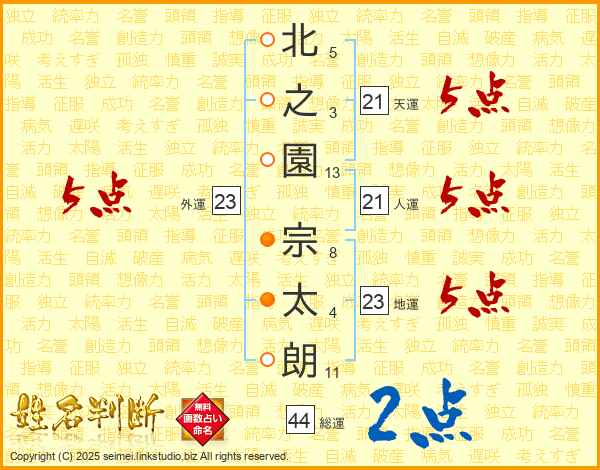 北(5画)之(3画)園(13画) 宗(8画)太(4画)朗(11画)
