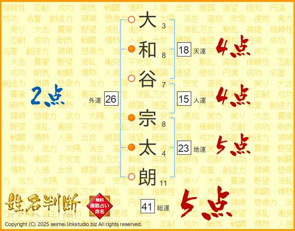大(3画)和(8画)谷(7画) 宗(8画)太(4画)朗(11画)