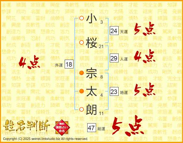 小(3画)桜(21画) 宗(8画)太(4画)朗(11画)