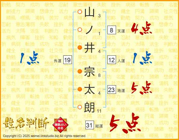 山(3画)ノ(1画)井(4画) 宗(8画)太(4画)朗(11画)