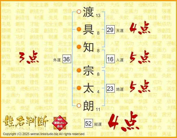 渡(13画)具(8画)知(8画) 宗(8画)太(4画)朗(11画)