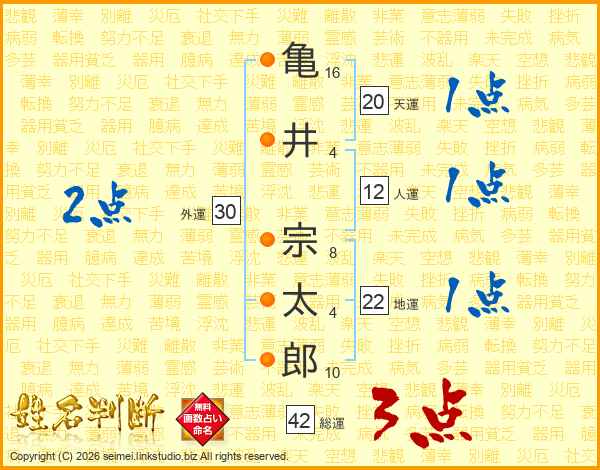 亀(16画)井(4画) 宗(8画)太(4画)郎(10画)