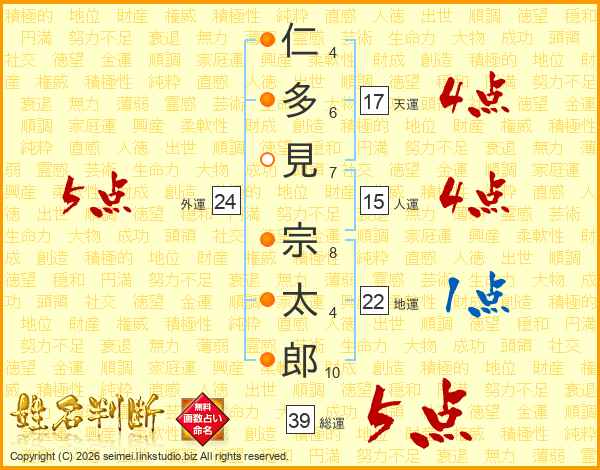仁多見宗太郎さんの総運は39画の5点!