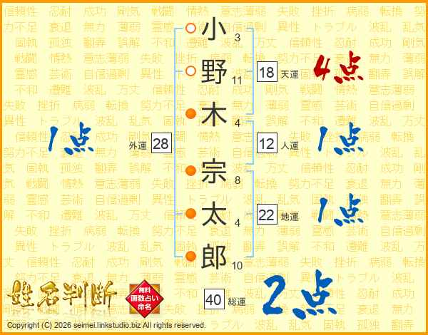 小野木宗太郎さんの総運は40画の2点!