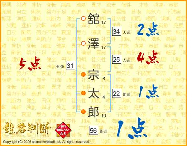 舘(17画)澤(17画) 宗(8画)太(4画)郎(10画)