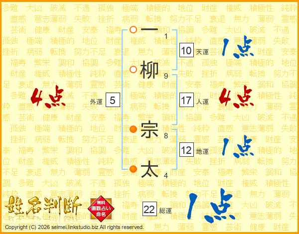 生活面を象徴する運勢です。外部から受ける影響力を表し、結婚運、家庭運や職場、環境への順応性を表します。総運から人運を引いた画数。姓や名が1文字の場合を除く。