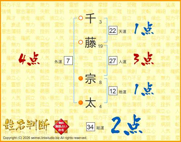 生活面を象徴する運勢です。外部から受ける影響力を表し、結婚運、家庭運や職場、環境への順応性を表します。総運から人運を引いた画数。姓や名が1文字の場合を除く。