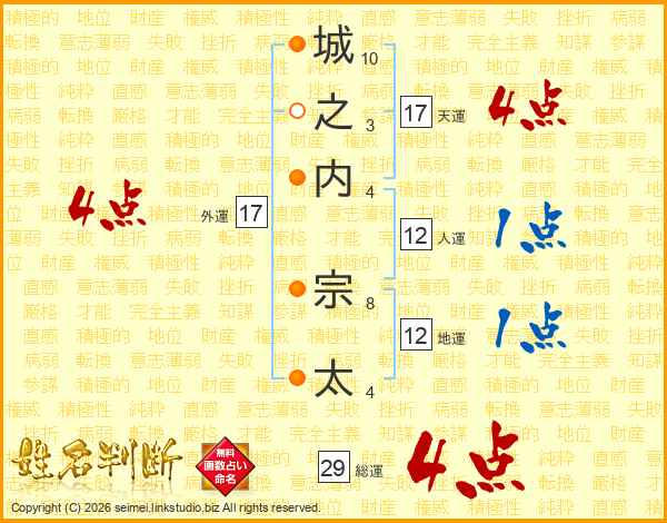 城(10画)之(3画)内(4画) 宗(8画)太(4画)