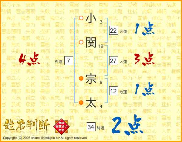 小(3画)関(19画) 宗(8画)太(4画)