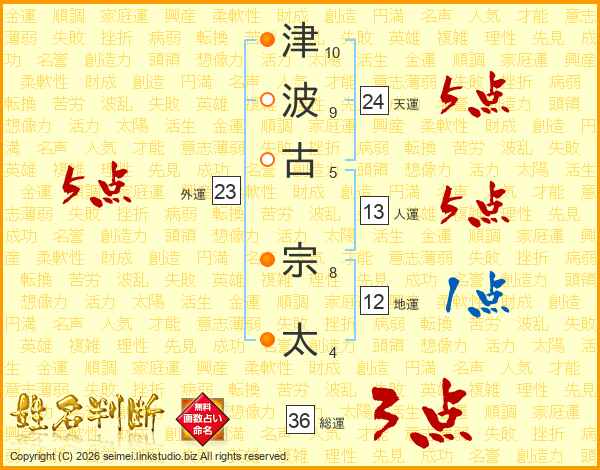津(10画)波(9画)古(5画) 宗(8画)太(4画)