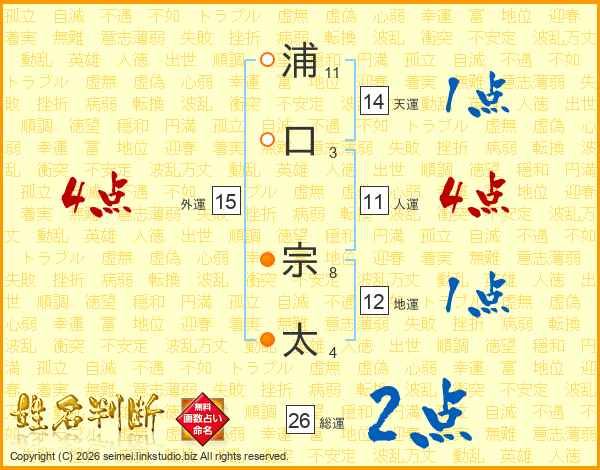 生活面を象徴する運勢です。外部から受ける影響力を表し、結婚運、家庭運や職場、環境への順応性を表します。総運から人運を引いた画数。姓や名が1文字の場合を除く。