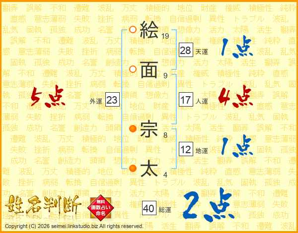 生活面を象徴する運勢です。外部から受ける影響力を表し、結婚運、家庭運や職場、環境への順応性を表します。総運から人運を引いた画数。姓や名が1文字の場合を除く。