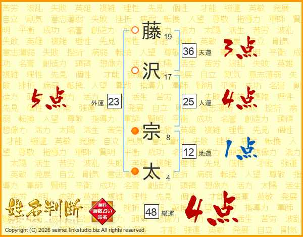 藤(19画)沢(17画) 宗(8画)太(4画)